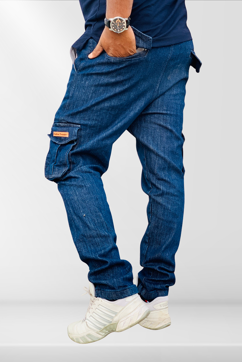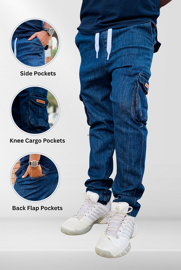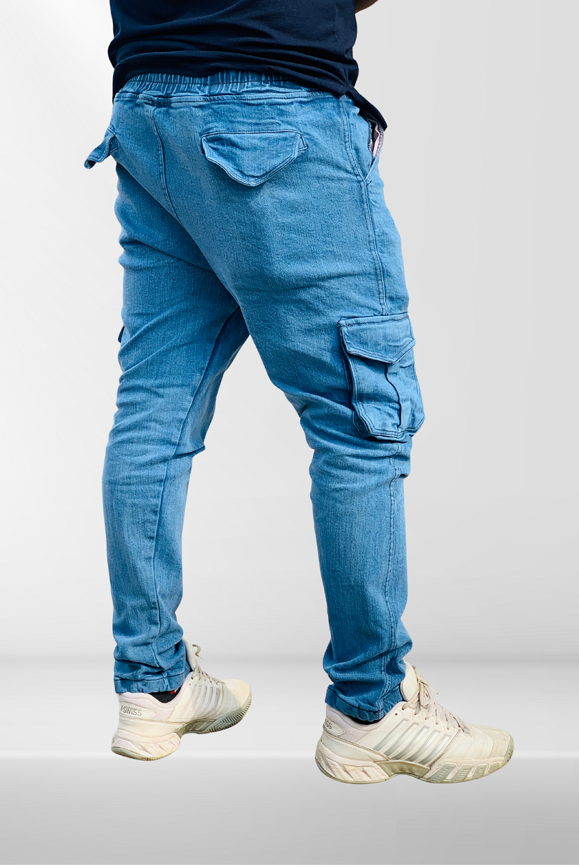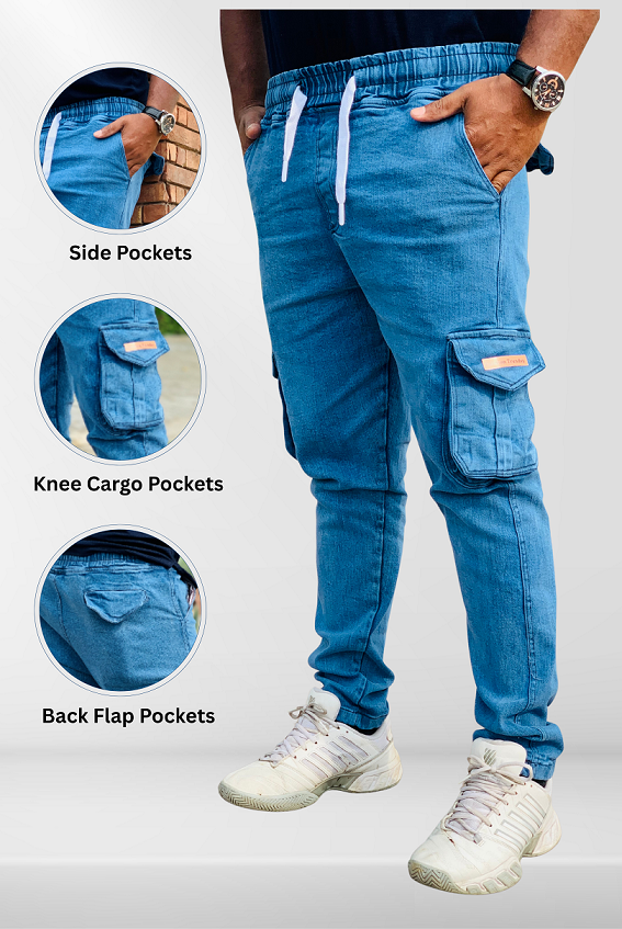 These Denim Cargo Trouser are made from a soft and durable Cotton and Lycra blend that offers all-day comfort and adjustable fit. Equipped with a total of six pockets, including front, back, and functional side cargo pockets. The elasticated waistband with a drawstring ensures a secure and adjustable fit. The light wash finish gives them a vintage feel, while the slim-fit design with tapered legs adds a modern touch.